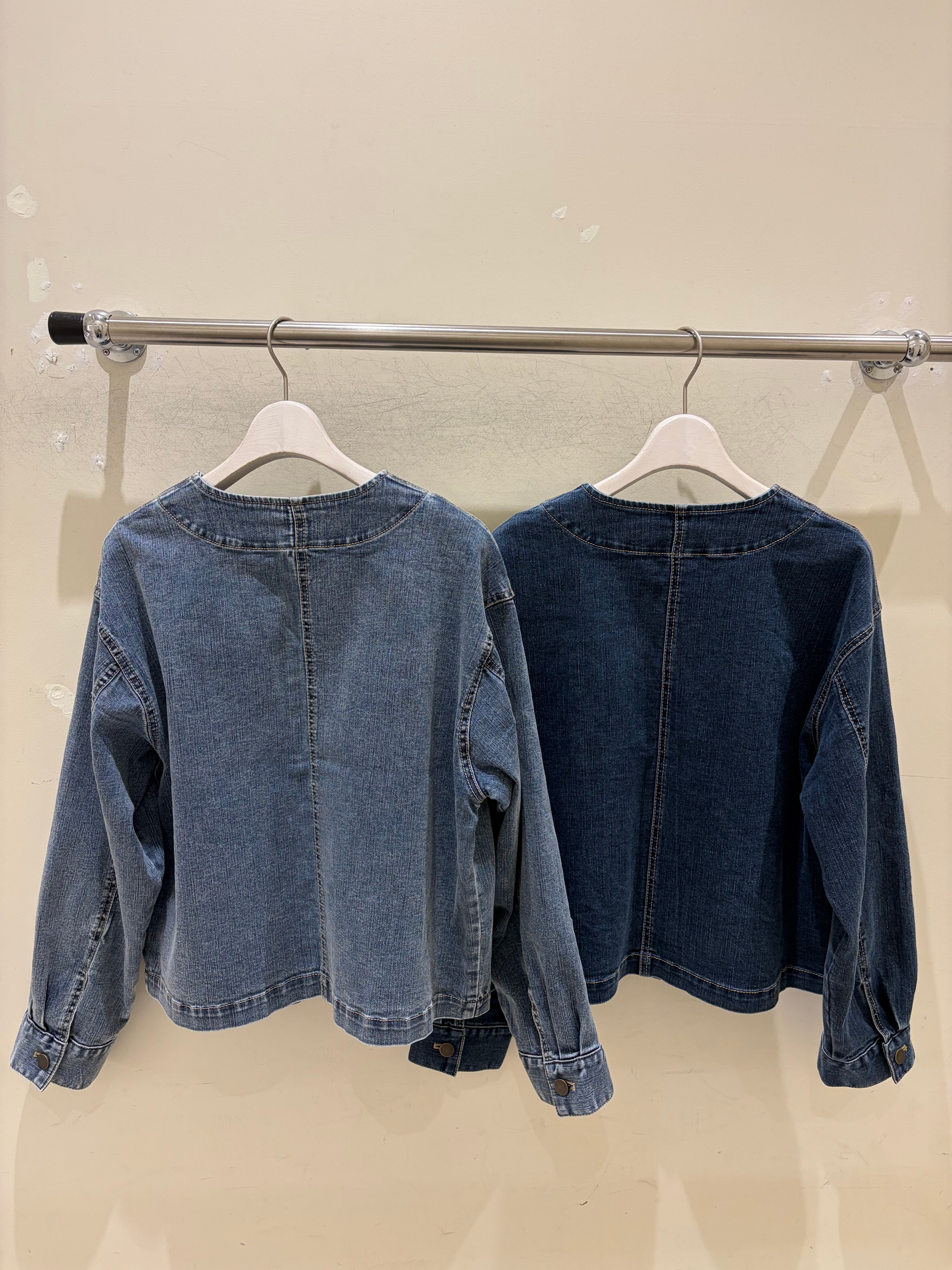 カジュアルの定番であるデニムを、女性らしくノーカラーで仕上げたジップアップジャケット。
